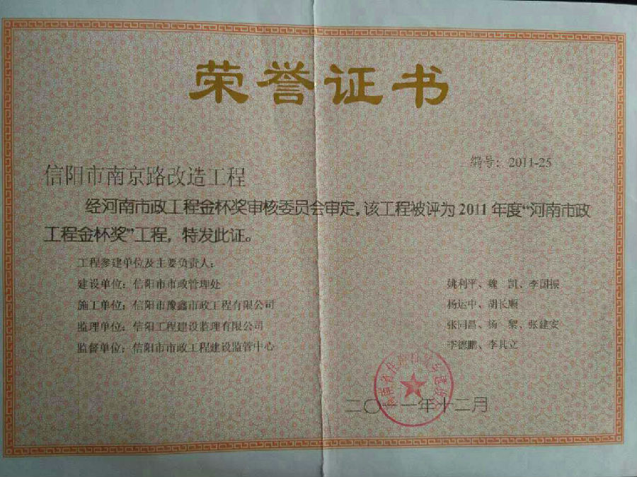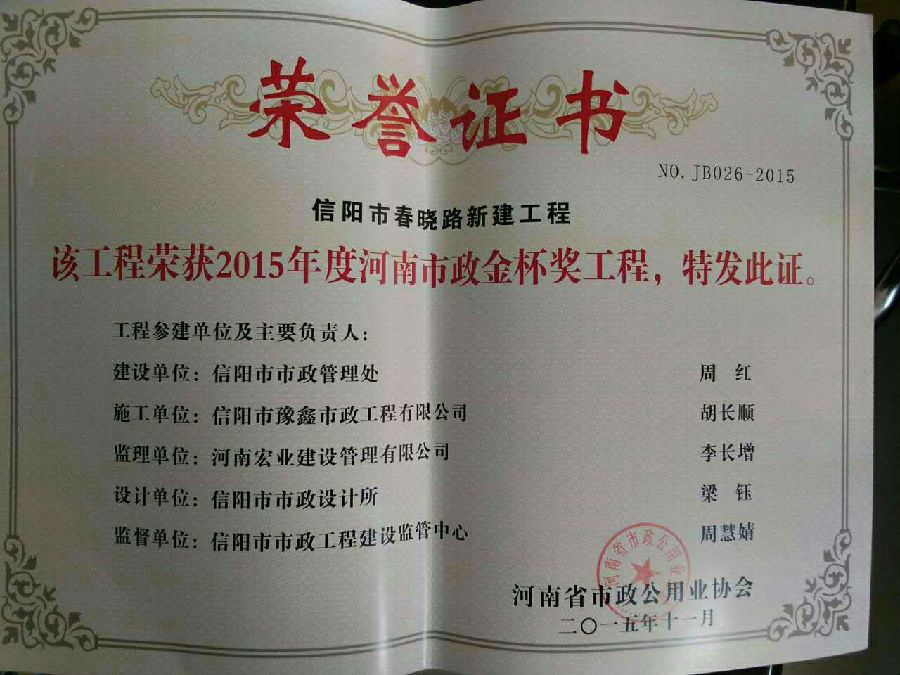 好風(fēng)憑借力,送我上青云。近年來(lái),公司積極參與城市市政基礎(chǔ)設(shè)施建設(shè)施工,積極參與市場(chǎng)競(jìng)爭(zhēng),先后承擔(dān)施工了市政府重點(diǎn)工程南京路道路改造工程、春曉路道路改造工程,東方紅大道道路改造工程、龍江東路新建工程等重點(diǎn)民生工程,其中南京路道路改造工程被省建設(shè)廳評(píng)為“中州杯”, 春曉路和東方紅大道道路改造工程被省建設(shè)廳評(píng)為“省優(yōu)工程”,成為城區(qū)一道道亮麗的風(fēng)景線。參與施工了市典范小區(qū)“臺(tái)北城上城”、“恒大名都”以及師范學(xué)院、職業(yè)技術(shù)學(xué)院、交警支隊(duì)和軍區(qū)道路工程,參與施工了雞公山管理區(qū)、南灣管理區(qū)、明港鎮(zhèn)和羅山縣等部分道路小區(qū)工程施工,累計(jì)大小各類施工工程三百余項(xiàng),企業(yè)影響力不斷擴(kuò)大、輻射力不斷增強(qiáng),市場(chǎng)份額不斷提高,企業(yè)信譽(yù)不斷彰顯,為信陽(yáng)城市建設(shè)做出了積極貢獻(xiàn),為企業(yè)的可持續(xù)發(fā)展插上了騰飛的翅膀。